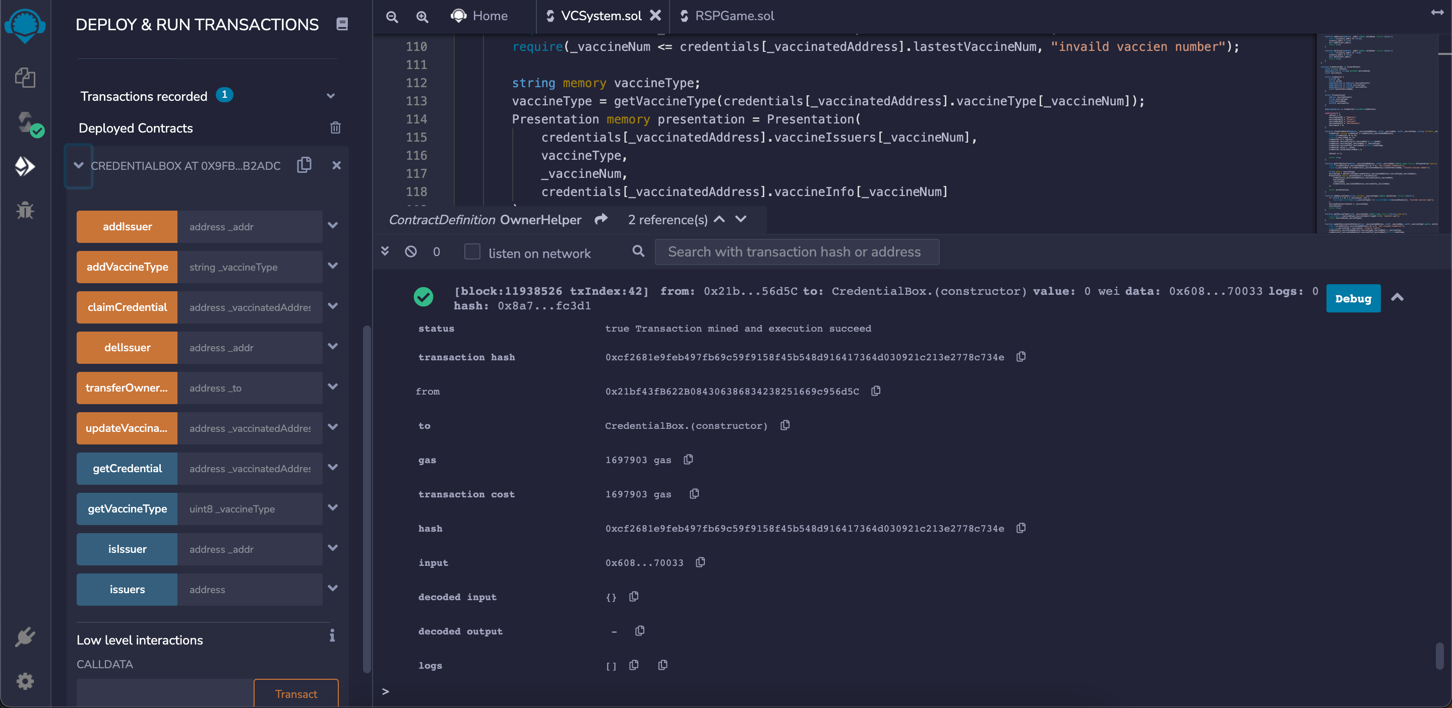백신 인증서로 변경하기 깃허브 : https://github.com/DobbyIsSlave/ha4-VCSystem.git 컨트랙트 주소 : 0x9fb3F9c2714B506509139dB63B72807E068B2Adc GitHub - DobbyIsSlave/ha4-VCSystem Contribute to DobbyIsSlave/ha4-VCSystem development by creating an account on GitHub. github.com struct Credential { uint256 id; string value; mapping(uint8 => address) vaccineIssuers; mapping(uint8 => uint8) vaccineType; mapping(uint8 => uin..